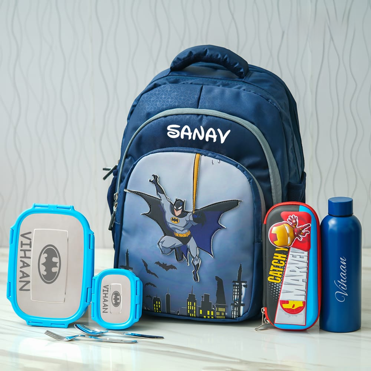 With 4 zip compartments, it provides organised storage for all essentials. The combo includes a Veigo jumbo lunch box set with a vegetable box and cutlery, a personalised stainless steel hot and cold bottle, and a hard case smiggle.