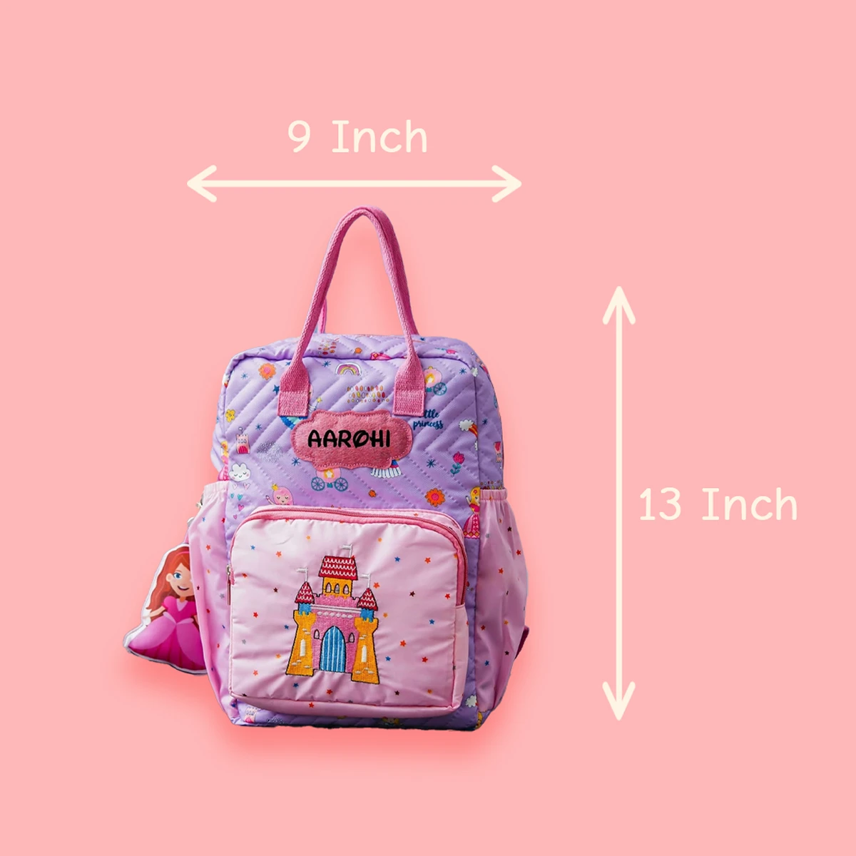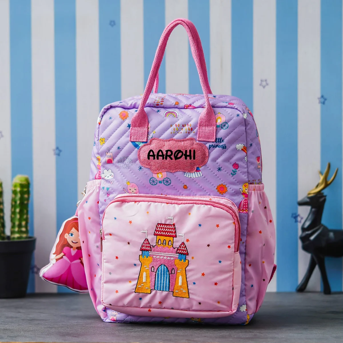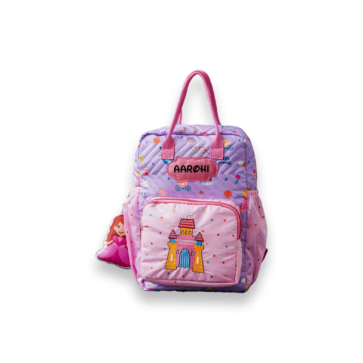A premium personalised kids backpack designed with your child’s name patch, embroidered character detail, and detachable 3D toy keychain. Made from water-resistant nylon cotton, this lightweight box-style backpack is perfect for school, travel, and birthday gifting.