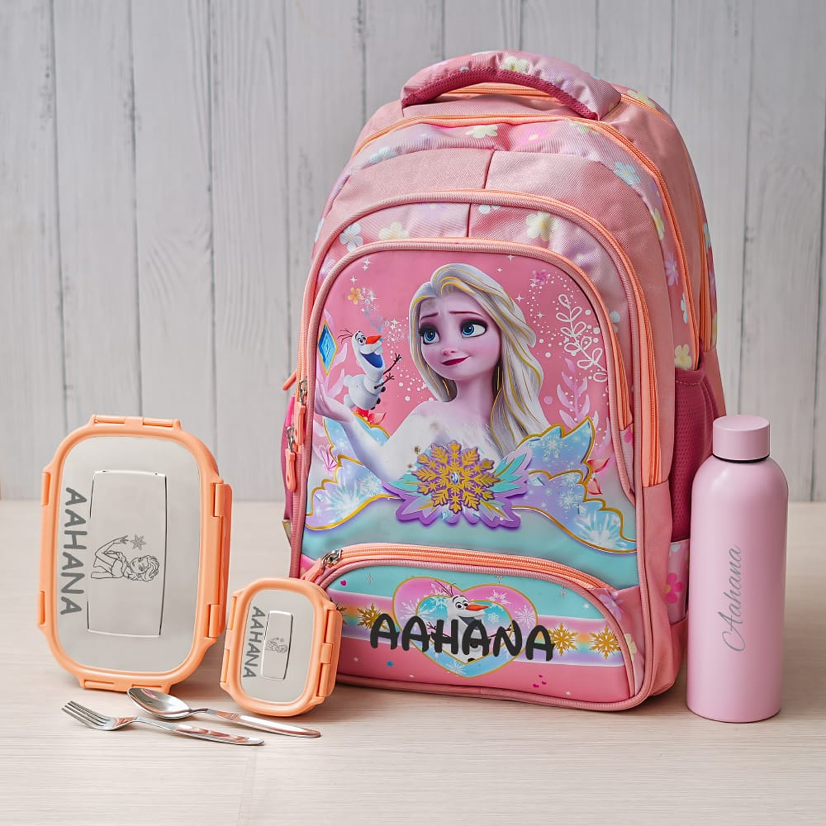 A magical Frozen-themed personalised backpack combo with lunch box, insulated bottle, and cutlery—designed for a complete and organised school experience.
