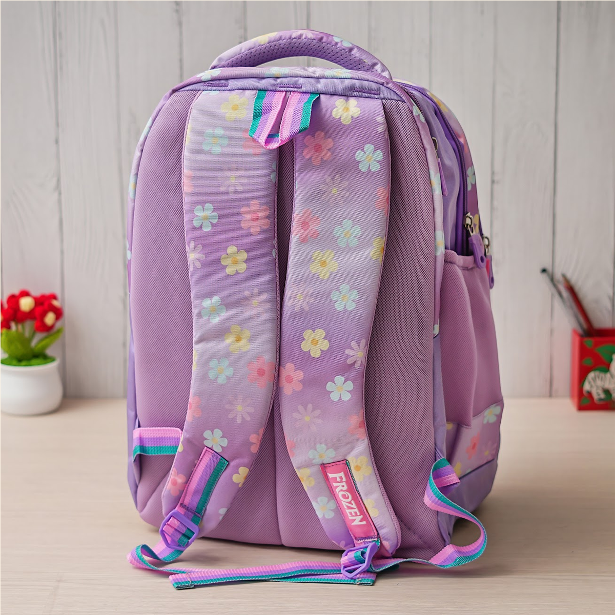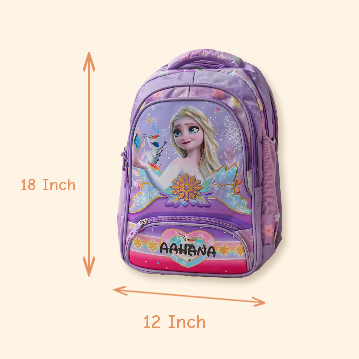 A stylish and spacious Frozen-themed personalised backpack with a glossy finish, designed for everyday school use and organised storage.