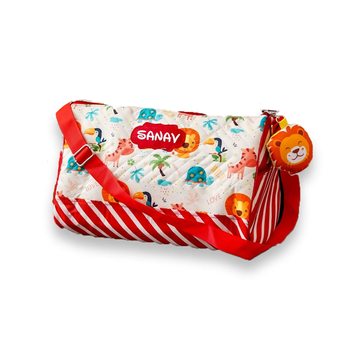 A premium personalised duffle bag designed for travel, sports, and activity classes. Features 2 side zipper pockets, printed inner lining, adjustable sling belt, and a matching toy keychain — making it both stylish and practical.