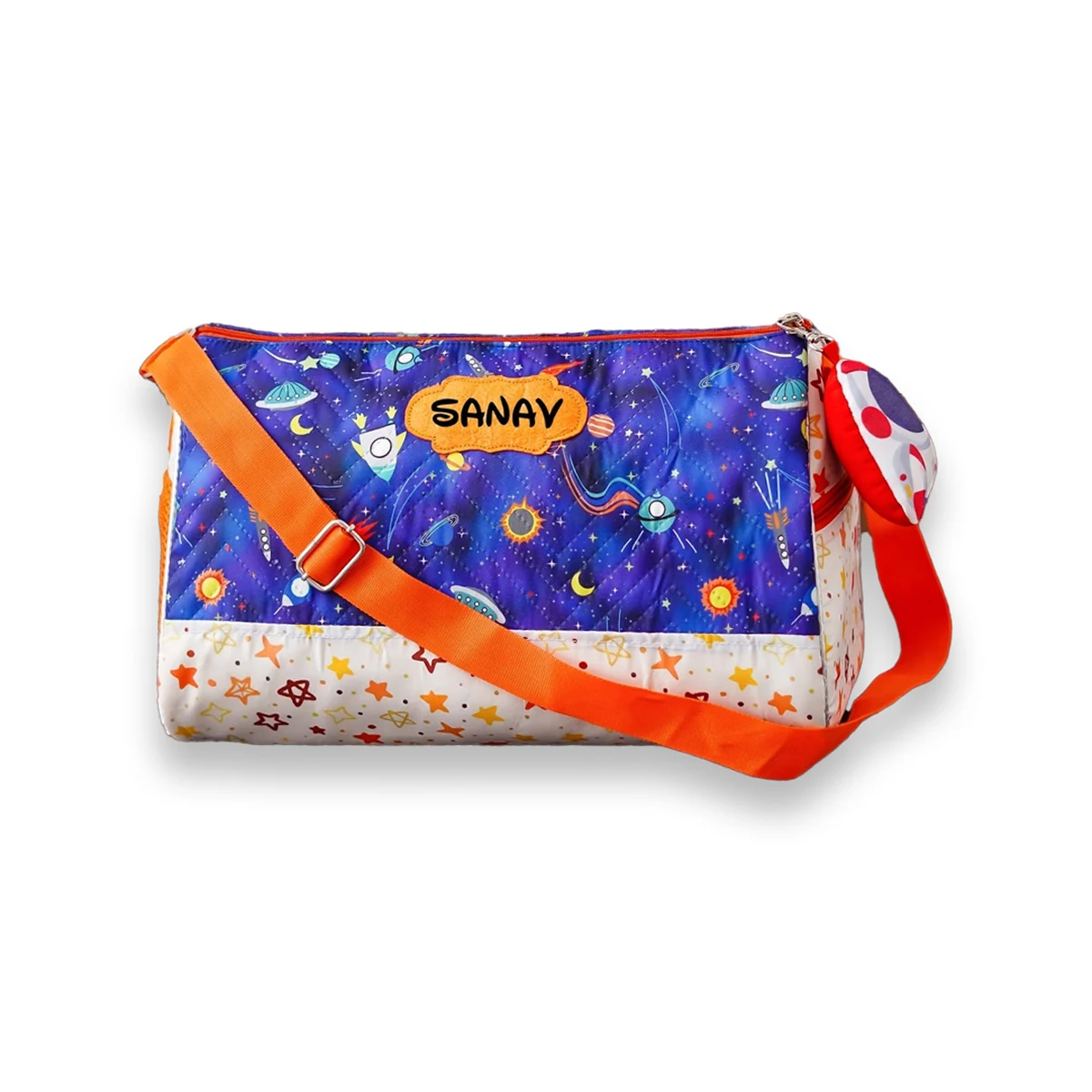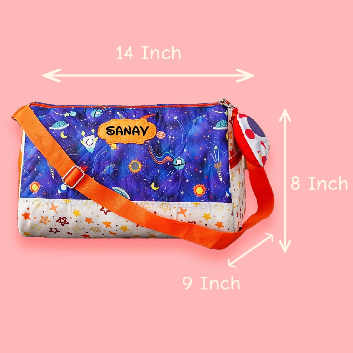 A premium personalised duffle bag designed for travel, sports, and activity classes. Features 2 side zipper pockets, printed inner lining, adjustable sling belt, and a matching toy keychain — making it both stylish and practical.
