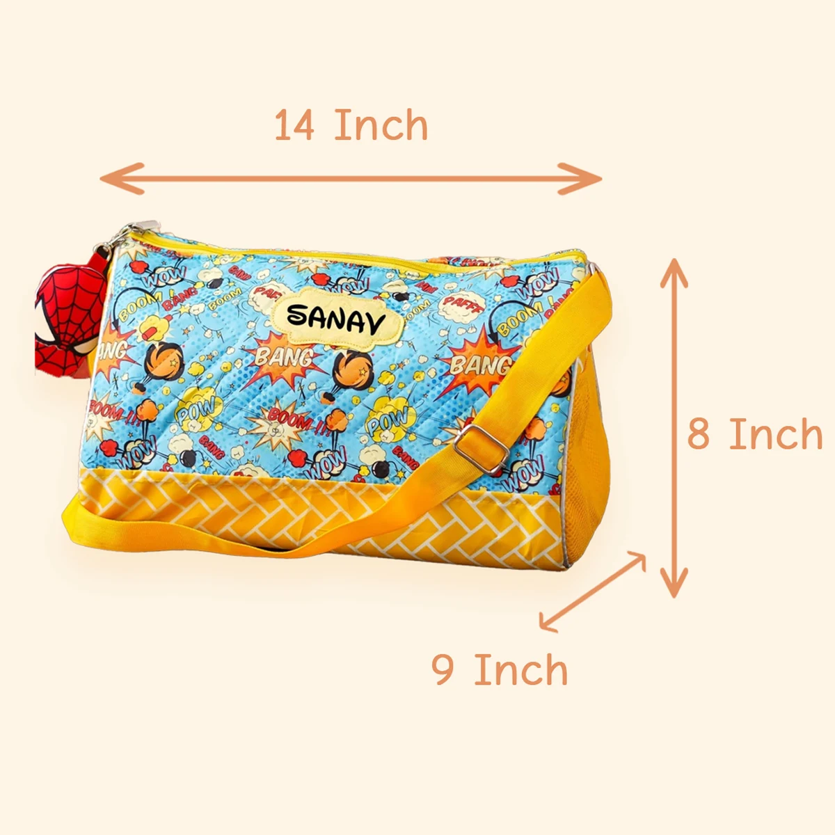 A premium personalised duffle bag designed for travel, sports, and activity classes. Features 2 side zipper pockets, printed inner lining, adjustable sling belt, and a matching toy keychain — making it both stylish and practical.