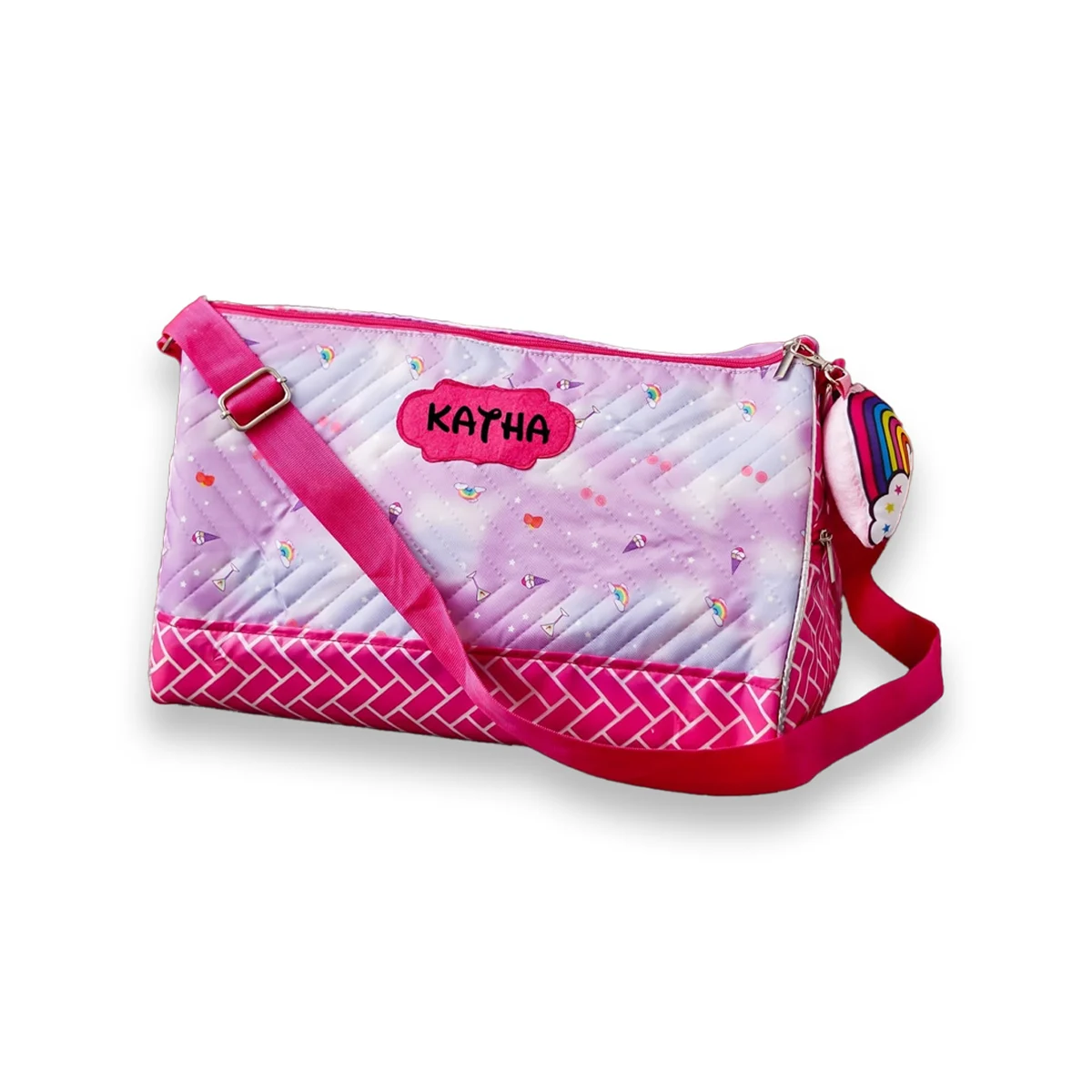 A premium personalised duffle bag designed for travel, sports, and activity classes. Features 2 side zipper pockets, printed inner lining, adjustable sling belt, and a matching toy keychain — making it both stylish and practical.