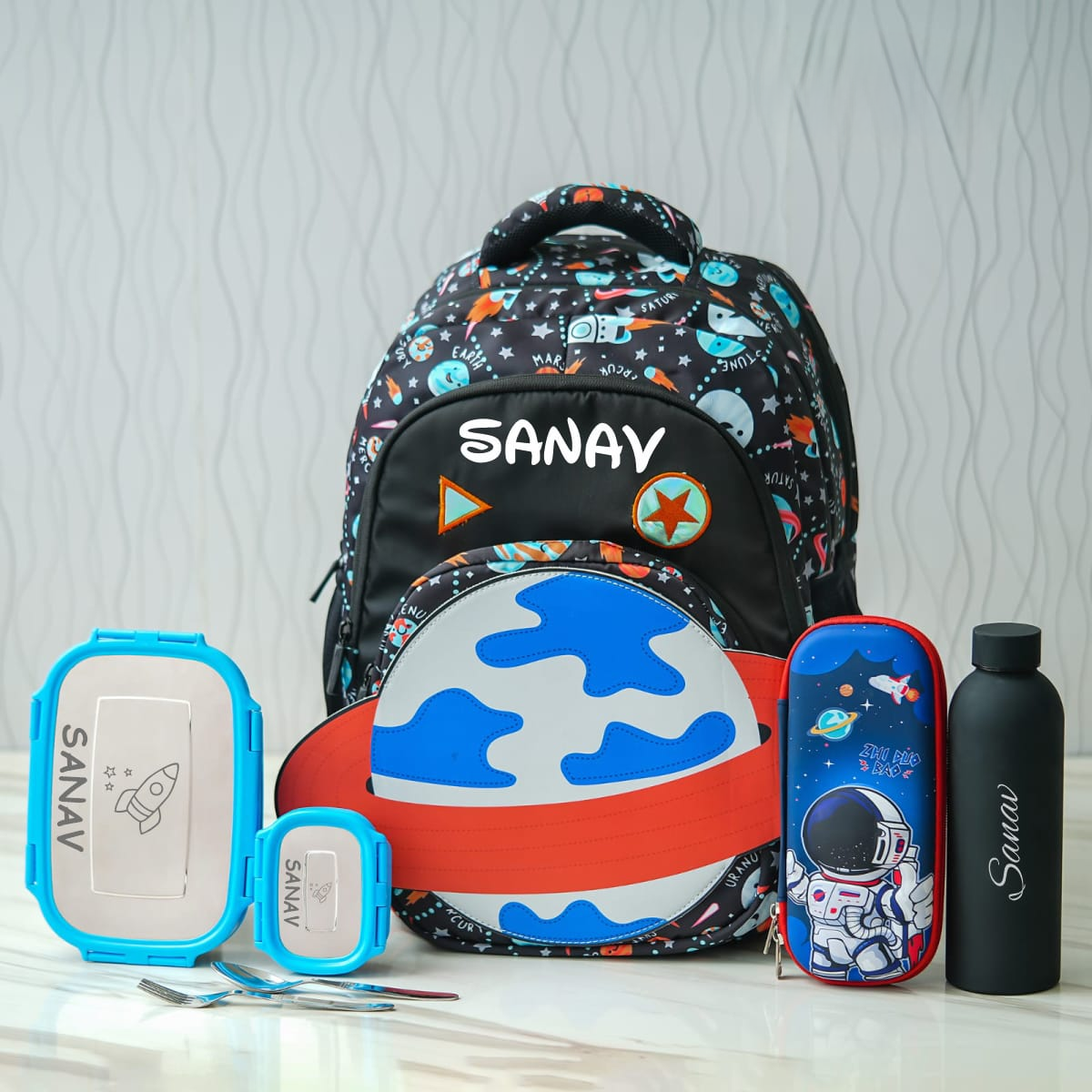 A versatile personalised backpack combo featuring a 3D patch design, complete with lunch box, insulated bottle, cutlery, and hard case pouch for a complete school setup.